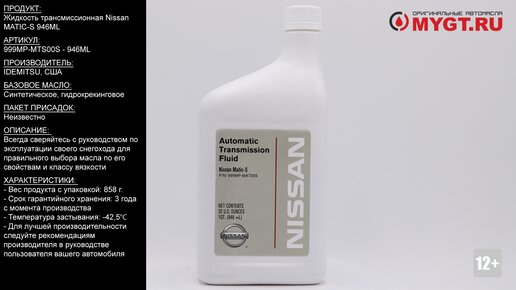 Продукт: Жидкость трансмиссионная Nissan MATIC-S 946ML Наш телефон: 8-800-550-57-22 ПН-ПТ 9.00-17.00 (МСК+4) Артикул: 999MP-MTS00S - 946ML Производитель: IDEMITSU, США Базовое масло: Синтетическое, гидрокрекинговое. Пакет присадок: Неизвестно Ссылка для покупки: https://mygt.ru/oil/original-oils-USA/nissan-matic-fluid-s-0946-l.html Трансмиссионная жидкость Nissan ATF Matic-S предназначена для использования в 5-ти ступенчатых АКПП автомобилей NISSAN и INFINITI,оснащенных электронной системой блокировки и электронной системой E-AT...