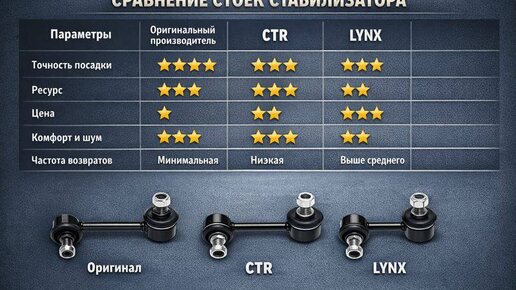 За время работы в продаже автозапчастей я заметил одну устойчивую закономерность. Когда речь заходила о стойках стабилизатора, в 8 случаях из 10 выбор сводился к трём вариантам: оригинальный производитель, CTR или LYNX. Причём это касалось самых разных автомобилей — от относительно свежих до машин с большим пробегом. Люди приходили с разными запросами и бюджетами, но в итоге почти всегда сравнивали именно эти бренды: оригинал — «чтобы поставить и забыть» CTR — «чтобы было надёжно, но без переплаты»...