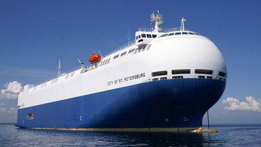 Судно принадлежит одной из Японских компаний и называется "CITY OF ST. PETERSBURG ". К Северной столице оно не имеет никакого отношения, кто знает, что на уме у тех, кто придумывает эти названия. Футуристичный дизайн и полукруглый носовой обтекатель - настоящее ноу-хау в мире судостроения. Японская компания Kyokuyo Shipyard Co построил это судно применив собственную технологию SSS - Semi-Spherically Shaped. Собственно её суть хорошо видна на фото - это сферический носовой обтекатель, готорый призван снизить сопротивление и сделать судно сверхэкономичным...