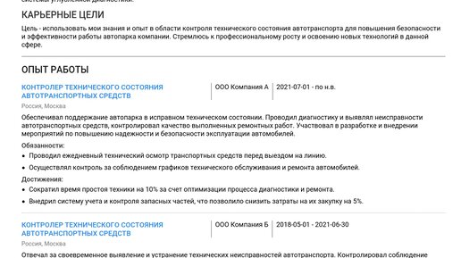 Пример резюме контролера технического состояния автотранспортных средств 2025