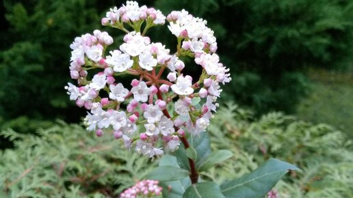 Одно из новых приобретений этого года - Калина лавролистная ( Viburnum tinus) 'Gwenllian' Я очень люблю разные калины. У меня растет и обыкновенная с красными плодами, и ее желтая версия Ксантокарпум (Xanthocarpum). Она отличается от обычной калины более медленным ростом, большей компактностью и осенней окраской ягод и листьев. У сорта Ксантокарпум желтые плоды и желтая окраска осенней листвы Разумеется, у меня растет и сорт с большими шарами стерильных цветов Розеум. Она же Бульдонеж или Стериль Есть еще сорт Нанум - совсем мелкая калина...