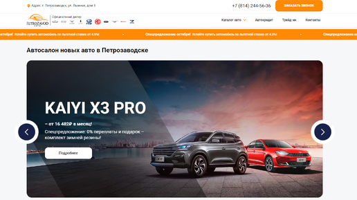 Петрозаводск Авто (Petrozavod Auto) — это автосалон, расположенный в столице республики Карелия. Занимается продажей новых автомобилей для частного и коммерческого использования. В футере сайта в качестве владельца указано рекламное агентство. Больше интересного — в нашем обзоре. В автосалоне на Лыжной 3 в Петрозаводске можно купить новый автомобиль как для личного пользования, так и для работы. В каталоге представлено более 30 марок. Однако их реальное наличие при анализе сайта установить не удалось...
