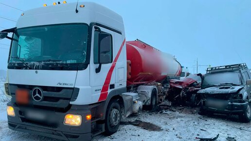 Днем 4 января на 43-м километре автодороги «Игра-Глазов» произошло ДТП с участием бензовоза. Пострадали два человека. Об этом сообщает УГИБДД по региону. Около 15 часов водитель автомобиля «Хендай Галлопер» - 45-летняя женщина, чем водительский стаж составляет всего 1,5 месяца, не справилась с управлением. Ее машину занесло: она выехала на встречку, где столкнулась с автомобилем «Черри Тигго». Последний автомобиль от столкновения наехал на стоящий на обочине бензовоз «Мерседес» с полуприцепом...