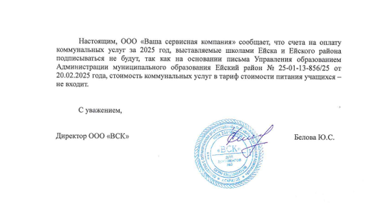 Рубрика: В чьих интересах «трудятся» чиновники УО Ейского района?! Речь пойдет о предприятии, которое кормит в школах детей, а именно ООО «Ваша Сервисная Компания», краткое наименование ООО «ВСК», директор Белова Юлия Сергеевна. Каким образом предприятие из Саратова, попало в Ейск?! В соответствии с данными из открытых источников, ООО «ФОРМУЛА ВКУСА-РЕГИОНЫ» предприятие, которое ранее кормила детей в школах , директор которого был Лыбзиков М.В., приобрело нового учредителя, а именно ООО «ВСК», а потом путем реорганизации в форме присоединения, ликвидировалось...