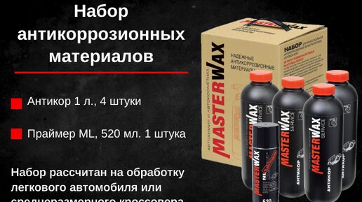 Уважаемые владельцы автомобилей и мастера автосервисов! Представляем вашего вниманию продукт, объединяющий наши лучшие материалы – Набор для антикоррозионной обработки автомобиля MW Service (Антикор+ML). В комплект входят следующие составы: * Антикор полимерно-битумный MasterWax Service, 1 л. – 4 шт. * ML праймер для битумных мастик MasterWax, 520 мл. – 1 шт.