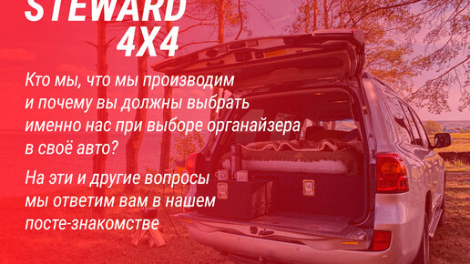Кто мы? Мы Steward 4Х4 – лидер в сфере производства органайзеров-спальников для внедорожников. За 5 лет работы мы успешно зарекомендовали себя на рынке автомобильного тюнинга в России и странах СНГ как профессионалы своего дела! Мы точно знаем как сделать Ваш внедорожник оснащеннее и лучше - навести порядок в багажнике, эффективно использовать его пространство, организовать полноценное спальное место в салоне, добавить ему практичности и уникальности! Производство STEWARD 4x4 Основной цикл нашего...