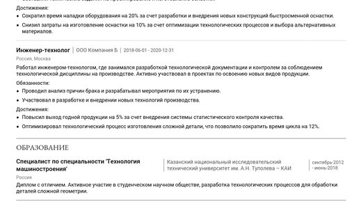 Пример резюме инженер-технолога по оснастке — ваш первый шаг к успешному трудоустройству в этой конкурентной сфере. Изучение готовых примеров поможет быстро и грамотно составить эффективное резюме, которое выделит вас среди кандидатов и приведет к заветному приглашению на собеседование. 🏆 Мы подготовили подробное руководство, основанное на актуальных требованиях работодателей, и предлагаем готовые примеры для специалистов разного уровня — от начинающих до опытных профессионалов. Вы найдете пошаговые...