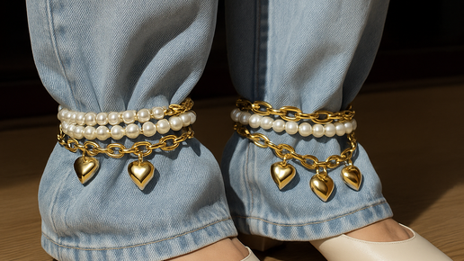 Мода – это постоянно меняющийся ландшафт, где привычные вещи переосмысливаются и предстают в новом свете. Тренды рождаются из смелых экспериментов и неожиданных сочетаний, и один из последних – это перемещение украшений с привычных мест (шеи, запястья) на нижнюю часть брюк и джинсов. Эта тенденция, которую можно назвать "обвесом" в самом неожиданном смысле, предполагает ношение браслетов и колье у щиколоток, превращая брюки в платформу для самовыражения. Не забудьте подписаться на Телеграм канал Стильная гавань - здесь все о моде, стиле и выгодных находках на маркетплейсах...