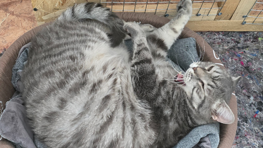 Шаман - так зовут этого полосатого красавца - свернулся в своей лежанке и упорно отворачивается от объектива. Словно понимает всю безнадежность ситуации лучше нас, взрослых. Крупный, действительно крупный. Кастрирован - это хорошо, одной проблемой меньше. Ходит в лоток аккуратно, древесный наполнитель предпочитает. Но что толку от всех этих "плюсов", когда за решеткой уже третий год подряд мяукают одни и те же морды? Что толку от его ласкового характера, если люди ищут котят "с родословной" за бешеные деньги? А он спит...