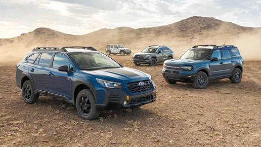 Сравнение Ford Bronco Sport, Jeep Wrangler Unlimited Sport, Subaru Outback Wilderness и Toyota RAV4 TRD Off-Road на дороге и без