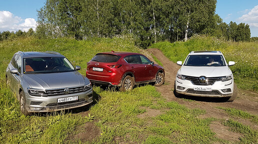 Сегодня мы посмотрим на новенькие кроссоверы ВНЕ ДОРОГ Рено Колеос, Мазда СХ5 и Фольксваген Тигуан! Почему у Volkswagen Tiguan отвалился бампер?
