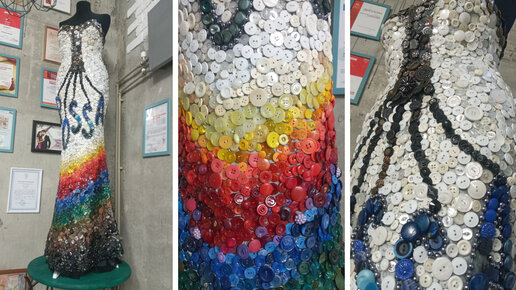 Ещё раз о Музее моды и портновского искусства им. Н.П.Ламановой в Нижнем Новгороде. Видео о музее здесь и здесь. Обычные пуговицы - почти все самой простой формы - плоские со сквозными отверстиями, совсем немножко тех, что на ножке... А какой эффект! Видео с показом платья здесь))) Я это платье не сразу углядела - в уголке поворотной лестницы на верхние галереи на постаменте, совсем не на виду. Практически мой размерчик! Видео здесь на моём канале. Очень фантазийно получилось. Катя сказала, что собирали эти пуговицы с миру по нитке...