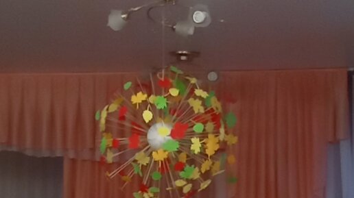 Уже который день, проводя музыкальные занятия, я любуюсь на новенький осенний шарик. На днях подвесили мы его к люстре в музыкальном зале, чтобы посмотреть, как будет выглядеть. Ребятки поют, танцуют, а я нет-нет да посмотрю на него, как он потихонечку кружится сам собой. Нежный, воздушный, красота неописуемая! Ну это ж надо было додуматься, такую красоту сконструировать. Автору идеи, теперь уже и не узнаешь, кто это, потому что встречала этот шарик не раз на просторах интернета, спасибо огромное...