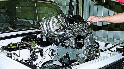 Снятие и установка двигателя на ваш автомобиль. Двигатель вынимается в верх, без коробки передач. Для извлечения двигателя нужен кран либо лебедка. Поскольку при этом разъединяются некоторые элементы на шасси, то для подъема автомобиля необходимо также стационарный подъемник или Гаражный домкрат. Перед монтажом двигателя всегда нужно прикрывать крылья. Демонтаж снятие двигателя отключить провод массы от аккумулятора Аккумулятор находится справа в нише под кожухом. В автомобилях с климатической установкой аккумулятор размещён под задним сиденьем...