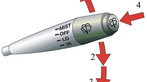 Включение очистителя и омывателя ветрового стекла (тип А) 1. Режим однократной работы 2. Малая скорость 3. Повышенная скорость 4. Включение стеклоомывателя Для включения очистителя переведите рычаг в нужное положение. Для включения омывателя нажмите кнопку (4) на торце рычага. Ключ зажигания должен находиться в положении On. Для включения однократной работы очистителя (при движении в тумане) переведите рычаг в положение MIST и отпустите. Если стеклоомыватель не включается, то проверьте наличие воды в бачке...