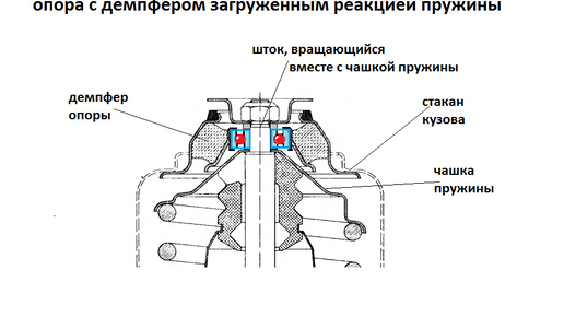 1) Опоры загруженные реакцией пружины (весом автомобиля приходящимся на данное колесо). В этой опоре, гайка штока стягивает жестко между собой детали: шток, верхнюю чашку пружины и нижнюю обойму опорного подшипника...
