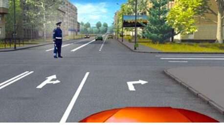 Официальные билеты сдачи теоретического экзамена ПДД в ГИБДД (ГАИ) содержат интересный вопрос. Это вопрос №6 в билете №30 (см. рис 1). В каком направлении можно продолжить движение по правой полосе? Сигнал регулировщика разрешает прямо и направо. Разметка 1.18 допускает движение с данной полосы только направо. Противоречие между сигналом регулировщика и требованием разметки – говорят нам в комментариях. В этом случае надо следовать сигналам регулировщика (п.6.15 ПДД) и можно ехать направо или прямо...