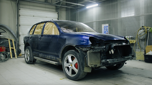 Всем привет. Наш новый проект - полное восстановление легендарного Porsche Cayenne Turbo S с мотором 4.5 на 521 лошадиную силу. Владелец автомобиля решил полностью его восстановить: исправить все дефекты, покрасить автомобиль в родной синий цвет, перебрать коробку и гильзовать двигатель. Автомобиль будет как новый. Для ремонта двигателя, например, будут использоваться только новые и родные детали. Примерная стоимость восстановления мотора около 1 млн.рублей! Представляете, какая это будет пушка? Итак, приступим к нашей части работы - восстановление и перекраска кузова...