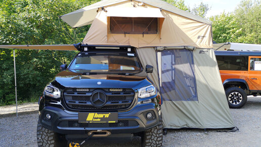 У нас были прокатные хайлаксы. На каждом пикапе было установлено по две палатки, что позволяло нам размещаться на крышах в полном составе "в-четвером" Ну, а теперь перейдем к обзору палаточных решений с немецкой выставки Переходим к мерсам...