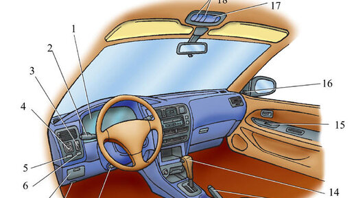 Панель управления, общий вид (для автомобилей с левосторонним управлением) 1. Комбинация приборов 2. Переключатель света фар и указателей поворота 3. Цифровой регулятор уровня подсветки шкалы приборов 4. Регулятор электропривода зеркалазаднего вида 5. Переключатель задних противотуманных фонарей 6. Переключатель электропривода замка двери или переключатель блокировки межосевого дифференциала 7. Ящик для мелочей 8. Рычаг замка капота 9. Фиксатор для регулирования угла наклона рулевой колонки 10. Переключатель лектроподогрева сидений 11...