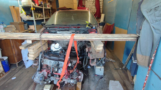 В планах было и есть привести кузов пассата в хорошее состояние.. и вот в связи с этим была необходимость снять мотор и желательно сразу с коробкой и всем навесным, ну что бы гора расчлененных запчастей не болталась под ногами.. Из подготовительных работ было сделано : Смысл на фото думаю понятен. Поднимаем с одной стороны и подкладываем бруски,идём и с другой стороны поднимаем и подкладываем брусок до тех пор пока мотор не вывесится над опорами...