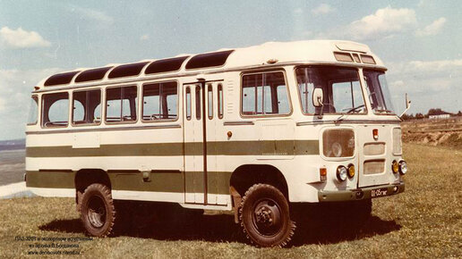Немного истории. Начало разработки автобуса повышенной проходимости с двумя ведущими мостами датируется осенью 1966 года. В основу конструкции шасси были заложены агрегаты нового грузовика ГАЗ-66. Кузов представлял собой однодверное исполнение базового автобуса ПАЗ-672. Рабочий вариант опытной машины сначала своего индекса не имел и проходил испытания под условным обозначением ПАЗ-672 (4х4).