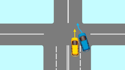 Это сложный дорожный мандат, в котором легко ошибиться. Посмотрите на схему задачи и попытайтесь определить, кто имеет преимущество на перекрестке, когда дорога сужена. Если вы сможете ответить правильно, то вы, вероятно, являетесь компетентным водителем. Итак, два автомобиля приближаются к перекрестку. Желтый находится в левой полосе, а синий - в правой. Оба водителя хотят ехать прямо, но дорога перед ними сужается - из двух полос остается только одна. Две машины не могут поместиться там одновременно, поэтому кто-то должен уступить дорогу...