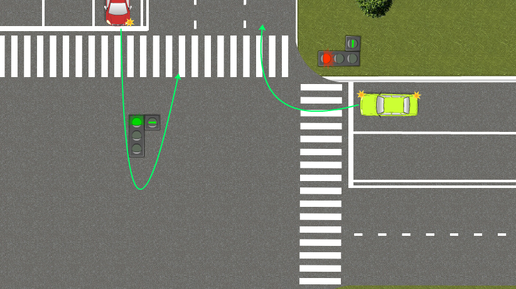 Взаимодействие водителей при взаимном пересечении траекторий при движении с основного сигнала светофора и «одинокой» стрелки определено. Пункт 13.5 ПДД России (пункт 104, первый абзац ПДД Беларуси) прямо указывают на преимущество водителя, управляющего машиной на основной сигнал светофора. Но на практике, после выполнения маневра, ситуация нередко имеет свое развитие. И здесь нужно быть внимательным. Исходные данные. Водитель красного автомобиля с крайней левой полосы совершает разворот. При этом сигнал в дополнительной секции одновременно включен и в дополнительной секции слева...