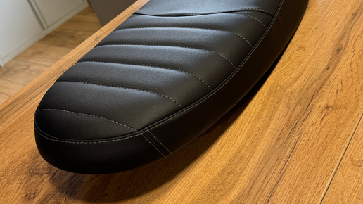 Перетяжка сиденья от мотоцикла в чёрную кожу. Владелец мотоцикла решил сменить его внешний вид, перекрасив в тёмно-серый цвет и коричневая сидушка уже не подходила по стилю, к тому же на ней были потёртости...