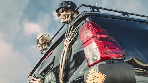 Восхищаюсь людьми, которые могут себе позволить и не боятся выделяться в серой массе. Не задумываясь об утилитарности, но оставаясь в памяти того, кто увидел их на дороге. Этот пикап Toyota Hilux точно будет оставаться в памяти встречных, это настоящий "Вестник Апокалипсиса"... Пикап универсален. В случае нападения зомби, он будет сжигать их мощными светодиодными прожекторами на расстоянии километра, а то и побольше. Зазевавшихся пешеходов в темноте, мало отличающихся от зомби, а также старушек спрятавшихся во мраке, будет распугивать череп на решетке радиатора...