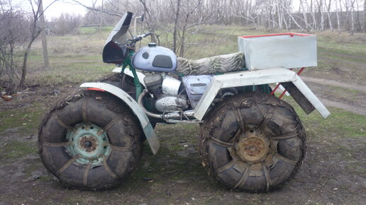 Самодельный вездеход из рамы и двигателя мотоцикла планета 3. Камеры взяты с колес комбайна размеры 12 на 16. Задний мост от ваз 2101. Мост разрезан посередине по креплению редуктора для того, чтобы можно было поставить звездочку за место шестерни, но перед тем как разрезать, нужно сварить мост дугой, чтобы не выставлять соосность подшипников...
