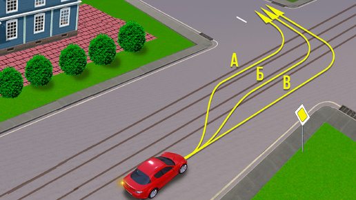 По какой траектории разрешается выполнить поворот налево? 1. По траектории А. 2. По траектории Б. 3. По траектории В. 4. По траекториям Б и В. Правильный вариант ответа в конце статьи. Ссылка на ПДД. 8.5. Перед поворотом направо, налево или разворотом водитель обязан заблаговременно занять соответствующее крайнее положение на проезжей части, предназначенной для движения в данном направлении, кроме случаев, когда совершается поворот при въезде на перекресток, где организовано круговое движение. При...