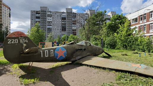 Вчера совершенно случайно оказался во дворе дома номер 24 по Шлиссельбургскому проспекту в Санкт-Петербурге. Решил срезать путь к станции метро Рыбацкое. Наткнулся на такой самолёт, расположенный на детской площадке при школе номер 574. Вроде как... самолёт и самолёт... Но данный объект показался мне интересным в том плане, что, во-первых, сделан он в натуральную величину, во-вторых, исполнен таким образом, что издалека кажется металлическим (хотя по факту деревянный), и, в третьих, он не не советский, а иностранный...