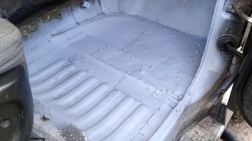 Иногда на ремонт пола кузова нет времени, а иногда он нерентабелен. В наш случае вместе с заменой брызговика Обнаружилось печальное состояние пола кузова под ногами переднего пассажира Протравливаем ортофосфорной кислотой . Далее вырезаем заплатки и прикручиваем их кровельными саморезами...