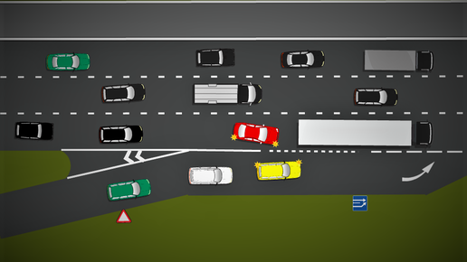На наших дорогах хватает спорных ситуаций, возможно это покажется глупостью, но такой простой вопрос, как полоса для разгона, вызывает много споров, как среди водителей, так среди инспекторов ГИБДД и судей. Вверху небольшая иллюстрация – есть загруженная дорога, по которой транспортные средства движутся плотным потоком с достаточно высокой скоростью. Всё-таки устройство дорог с точки зрения безопасности у нас улучшается, а поэтому в подобных местах чаще всего имеется специальная полоса для разгона...