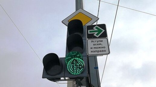 Пока только на одном перекрестке в одном городе России (Казани) был установлен этот знак. Он разрешает поворот направо на запрещающий сигнал светофора. Этот экспериментальный знак появился около торгового центра "Тандем" на пересечении улицы Горсоветской и Декабристов. Этот знак разрешает поворот с улицы Декабристов на Горсоветскую направо в том случае если водитель пропустил впереди себя всех участников движения и не препятствует движению. Знак состоит из 2 частей...