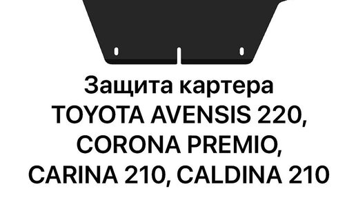 Защита картера Toyota Avensis, Carina, Corona Premio, Caldina Защита картера специально разработана для автомобилей: Toyota Avensis 1997-2003г Toyota Carina 1996-2001г Toyota Corona Premio 1996-2001г Toyota...