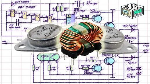 Схема мощного DC-DC преобразователя напряжения +6В в +12В, максимальная нагрузка до 100 Ватт. В оригинале схема предназначалась для получения напряжения 220 вольт из 12. При переработке пришлось, естественно, внести некоторые коррективы в номиналы деталей и саму схему. Загляните на мой Телеграмм КАНАЛ Азбука РадиоСхем Вместо рубильника введена управляющая цепь, улучшено включение оптрона, введена цепь питания ТТЛ-микросхем, отсутствовавшая в первоисточнике. Они здесь работают при напряжении питания 5,5 вольт, что на надежности никак не сказывается...