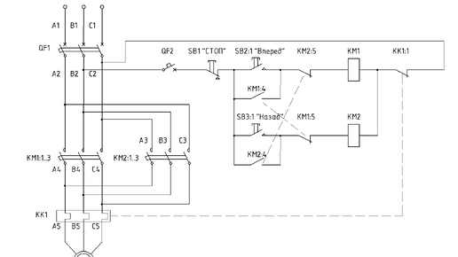 Как и обещал в предыдущей статье, привожу схему реверсивного пуска асинхронного двигателя посредством двух магнитных пускателей. Принцип работы аналогичен нереверсивному запуску, поэтому подробно останавливаться не будем. Главным отличием является использование дополнительных блокировочных контактов КМ1:5 и КМ2:5. Известно, что для изменения направления вращения необходимо изменить чередование фаз (в приведенной схеме поменяны местами фазы А и С). И в случае одновременного включения обоих магнитных пускателей, произойдет короткое замыкание на контактах магнитного пускателя КМ1:1...