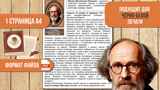 📄 Краткая биография русского писателя Михаила Михайловича Пришвина расположена на одном листе А4. Материал представлен в формате PDF. ❗Данный материал можно скачать здесь. 👉 На заметку! В настройках печати вашего принтера можно выбрать такие варианты: размещение одного материала на одном листе A4 или печать двух копий материала на одном листе A4 (в этом случае каждая копия будет размером A5). Биография Александра Александровича Блока доступна для печати как на цветном, так и на чёрно-белом принтере...