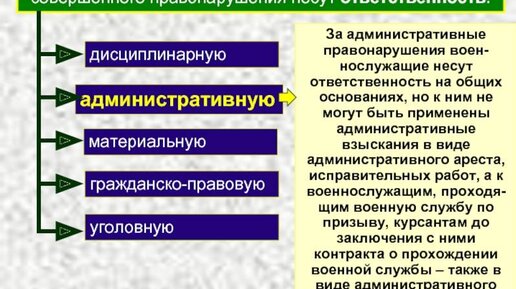В данной статье мы рассмотрим виды юридической ответственности по отношению к военнослужащим и узнаем, какое наказание применяется в каждом из случаев. Рассмотрим федеральные законы, которые относятся к военной деятельности, а также иные законодательные акты. Виды юридической ответственности военнослужащих Военнослужащего могут привлечь к различного рода ответственности, в зависимости от характера нарушения к гражданину применяется один из видов ответственности и назначается соответствующее наказание...