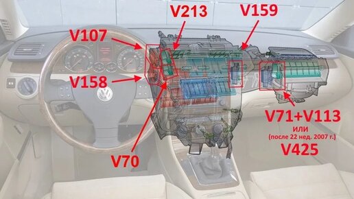 Что бы начинать ремонт нужно разобраться, что и где есть, а так же работу сервопривода. Сервопривод — электрический двигатель, регулирующий положение заслонки. Каждый управляет одной либо несколькими приводами заслонками, и работают от блока управлением климата. Приводы: V70 (3C0 907 511 E) - центральная заслонка. V113 (3C1 907 511 H) - заслонка рециркуляции. V425 (V71) - (3C0 907 511 A) - заслонка приточной вентиляции, воздухозаборника и (для V425) - рециркуляция. V107 (3C1 907 511 A) - заслонка размораживателя V159 (3C0 907 511 R) - заслонка правая, регулировки температуры...