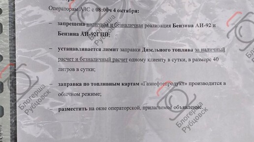На некоторых заправках АИ-92 отпускают по 20 литров, а на других его и вовсе нет. Для дизельного топлива лимиты выше — по 40 литров Отпуск топлива ограничили на некоторых АЗС в Рубцовске. Снимки объявлений, которые появились на станциях, опубликовал telegram-канал "Блогерша Рубцовск". Так, на одной из заправок заявили об ограничениях в 20 литров для АИ-92 и АИ-95, а также в 40 литров — для дизельного топлива. В качестве причины указывается отсутствие отгрузки топлива с нефтеперерабатывающих заводов...