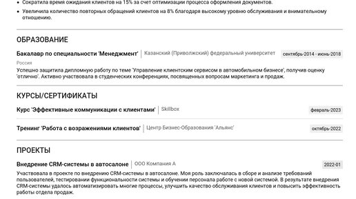 Примеры резюме администратора автосалона — лучший способ быстро понять, как составить документ, который заметит работодатель. Изучение готовых примеров поможет создать эффективное резюме и получить работу мечты. В этой статье мы собрали готовые примеры резюме администратора автосалона для начинающих и опытных специалистов, а также пошаговые инструкции по каждому разделу. Здесь вы найдете: 👇 Изучив пример, вы сможете создать резюме с помощью нашего конструктора резюме. Заголовок резюме – это первое, что видит рекрутер...