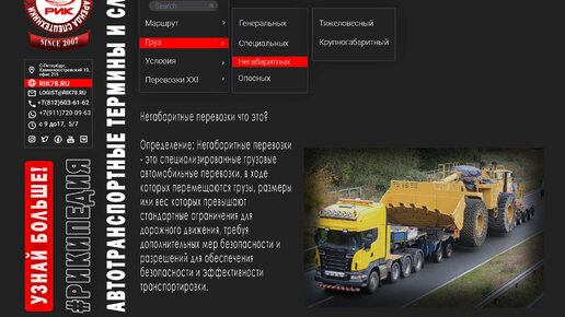 2.3 К негабаритным перевозкам относят транспортировку грузов, размеры или масса которых превышает установленные в Правилах Дорожного Движения (ПДД). В статье 23.5 говорится: Движение транспортного средства, габаритные параметры которого с грузом или без него превышают по ширине 2,55 м (2,6 м – для рефрижераторов и изотермических кузовов), по высоте 4 м от поверхности проезжей части, по длине (включая один прицеп) 20 м, либо движение транспортного средства с грузом, выступающим за заднюю точку габарита...
