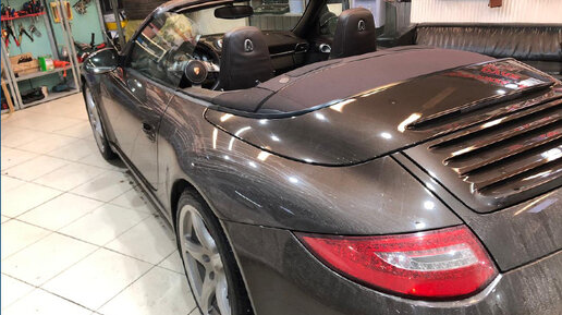 А сегодня у нас в гостях был Porsche Carrera. Он приезжал на пропитку крыши. Некоторые компании пропитывают тенты кабриолетов однокомпонентной пропиткой. В принципе она тоже работает, но совсем недолго, причем это только гидрофоб (отталкивает только воду). Мы наносим три слоя с промежуточной сушкой...