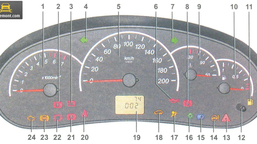 Тахометр. Частота вращения коленчатого вала. Нельзя чтобы стрелка заходила в красную зону. Красная зона опасна для двигателя. Лампа неисправности распределителя тормозных сил. Загорается красным на несколько секунд при включении зажигания. Если лампа горит в других случаях, то это может говорить о неисправности системы.  Лампа заряда АКБ. Загорается красным при включении зажигания и гаснет сразу после запуска мотора. Если горит и после запуска двигателя, то это указывает на закончившийся заряд АКБ/неисправность АКБ...