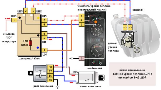 Датчик уровня топлива (ДУТ) автомобилей ВАЗ 2104, 2105 и 2107 установлен в топливном баке (бензобаке). На заборнике топлива. Он представляет собой реостат, по которому перемещается контакт, соединенный с подвижным поплавком. Этот датчик работает заодно со стрелочным указателем уровня топлива и контрольной лампой резерва топлива в комбинации приборов. Они объединены в одну электрическую цепь. Оригинал статьи смотри на нашем сайте twokarburators.ru - "Доработка датчика уровня топлива (ДУТ) ВАЗ 2107, ВАЗ 2105"...