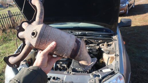 Как вы знаете, я никогда не топил за удаление катализатора из системы автомобиля, так как считаю, что от этого элемента пользы намного больше чем вреда. И просто так, по своему хотению, так сказать, я никогда бы не стал избавляться от нейтрализатора. Но пришлось это сделать после 150 000 рублей на родительской Калине, и сейчас расскажу, почему. Признаков, которые бы говорили о том, что с катализатор забился, оплавился или раскрошился внутри, не было. Но проблема заключалась в том, что прогорел, причём в нескольких местах сам корпус коллектора...