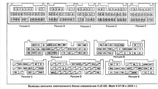 Распиновка проводов мозгов 1jz Распишу только разъемы D и E т.к они пустые. Разъем D 1. STP — + от нажатой педали тормоза 2. RDEF — реле включения обогрева заднего стекла 3. STA — + в момент прокрутки стартера 4. TAM — датчик температуры наружного воздуха 5. PRE — двойной выключатель по давлению 6. MPX1 — Блок управления салонный кондиционером 7. 3 и L — + с переключателя на АКПП положение селектора Теперь подключение, чтобы завести мотор надо запитать через главное реле B2 и В. Поворачивая ключ...